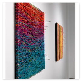 Mutamenti - 2023 - Tecnica mista ( fili acrilici, specchi, inserti in plastica, su legno)