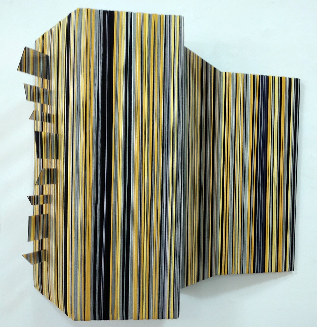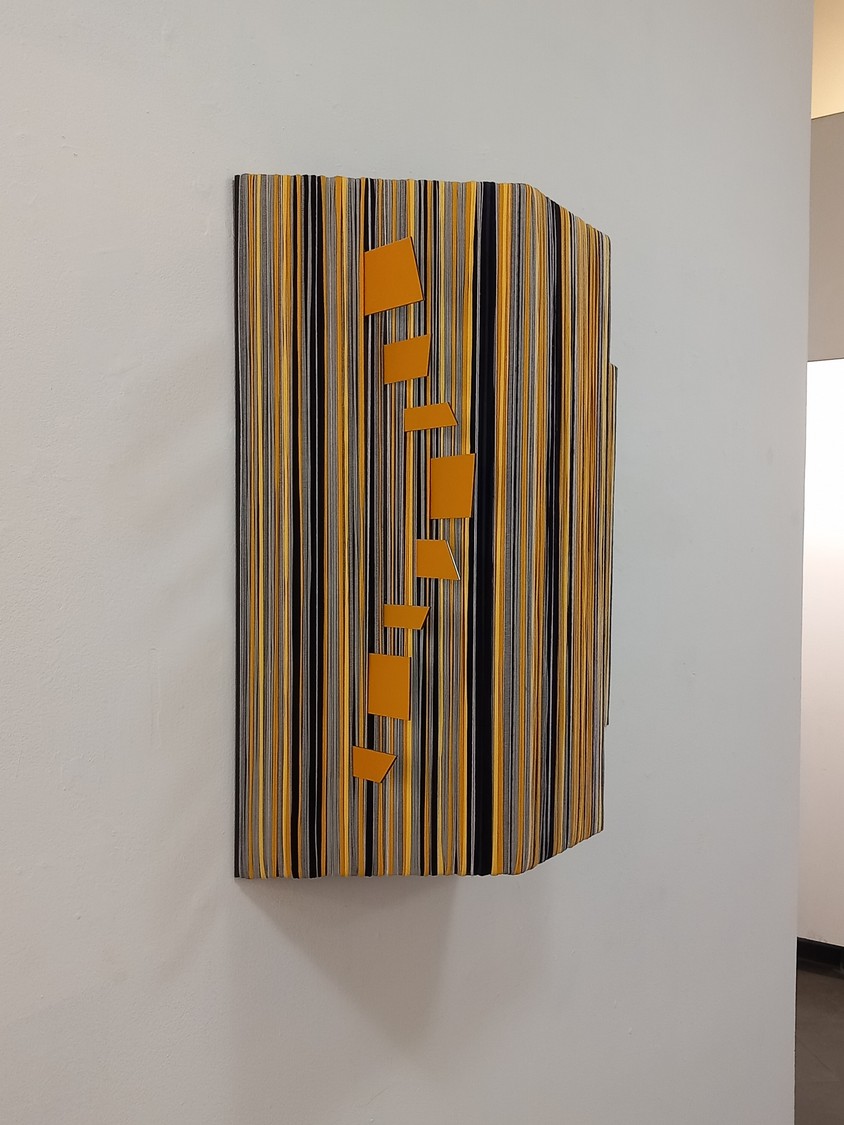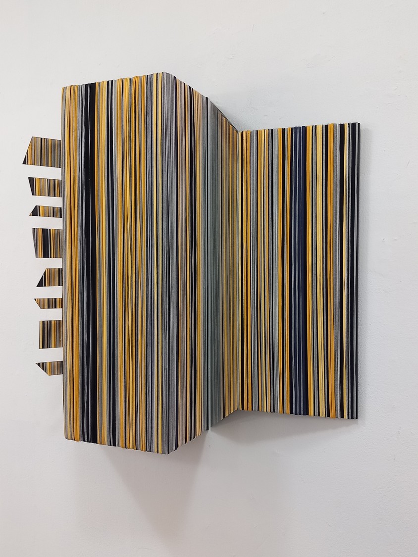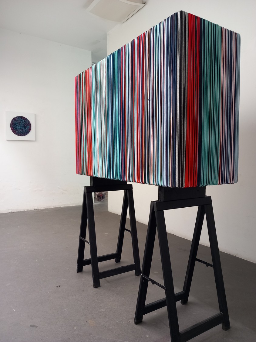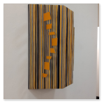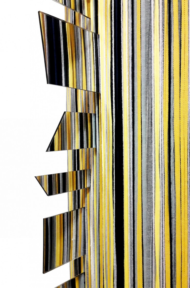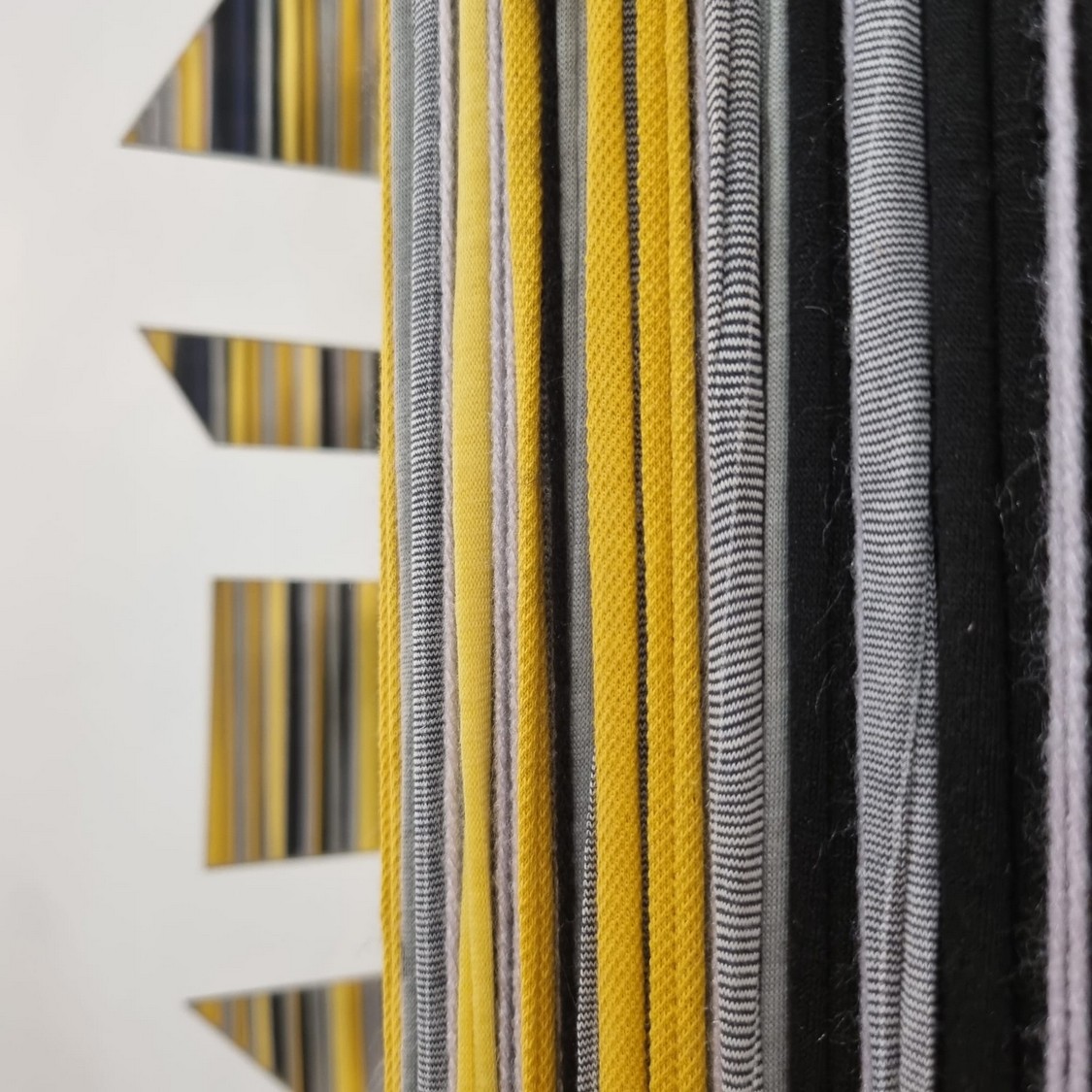 Tecnica mista: Fettucce di tessuto, fili acrilici, specchi su legno